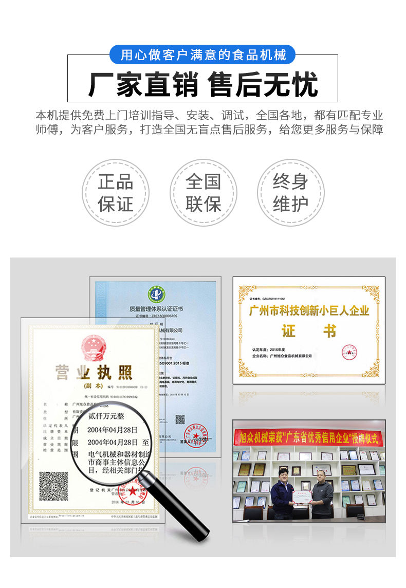廣州旭眾食品機(jī)械有限公司是一家集科研開發(fā),生產(chǎn)設(shè)計(jì),營銷服務(wù)為一體的現(xiàn)代化生產(chǎn)企業(yè)?,F(xiàn)代化生產(chǎn)車間,精湛制造技術(shù),所產(chǎn)機(jī)械歷經(jīng)市場重重考驗(yàn),不斷贏得海內(nèi)外客戶的贊譽(yù)。