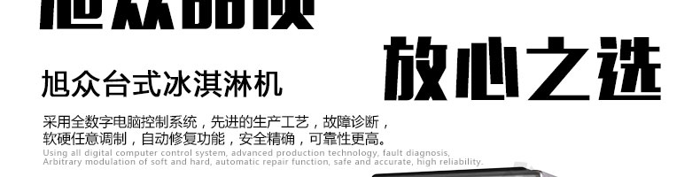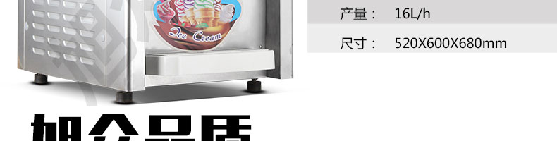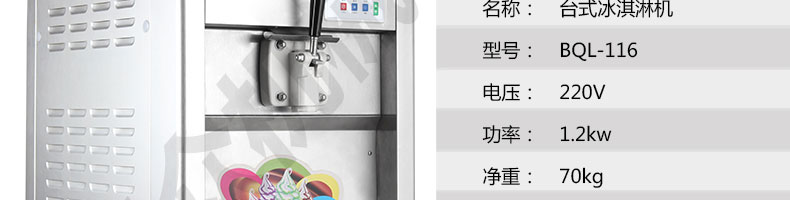 BQL-116臺(tái)式冰淇淋機(jī),●選用國(guó)際名牌成熟制冷配套件和高效壓縮機(jī),融合旭眾精湛工藝輔以嚴(yán)格的質(zhì)量控制流程,使產(chǎn)品整體性能及品質(zhì)得以全面提升?!癫捎萌珨?shù)字電腦控制系統(tǒng),選用名牌優(yōu)質(zhì)電器元件,先進(jìn)的生產(chǎn)工藝,故障診斷,軟硬任意調(diào)制,自動(dòng)修復(fù)功能,安全精確,可靠性更高?!駥I(yè)成熟制冷系統(tǒng)設(shè)計(jì),選用世界名牌大功率專用壓縮機(jī),大大縮短冰淇淋成型時(shí)間,相同時(shí)間內(nèi)冰淇淋產(chǎn)量大幅度增加,使您生意火爆時(shí)依然得心應(yīng)手,為您創(chuàng)造財(cái)富?!癜踩椒€(wěn)的機(jī)械攪拌系統(tǒng),噪音更低、振動(dòng)更小,使整機(jī)運(yùn)行性能達(dá)到國(guó)際先進(jìn)水平。●確保進(jìn)料溫度在0°C~35°C;環(huán)境溫度5°C~40°C勻可正常使用。
