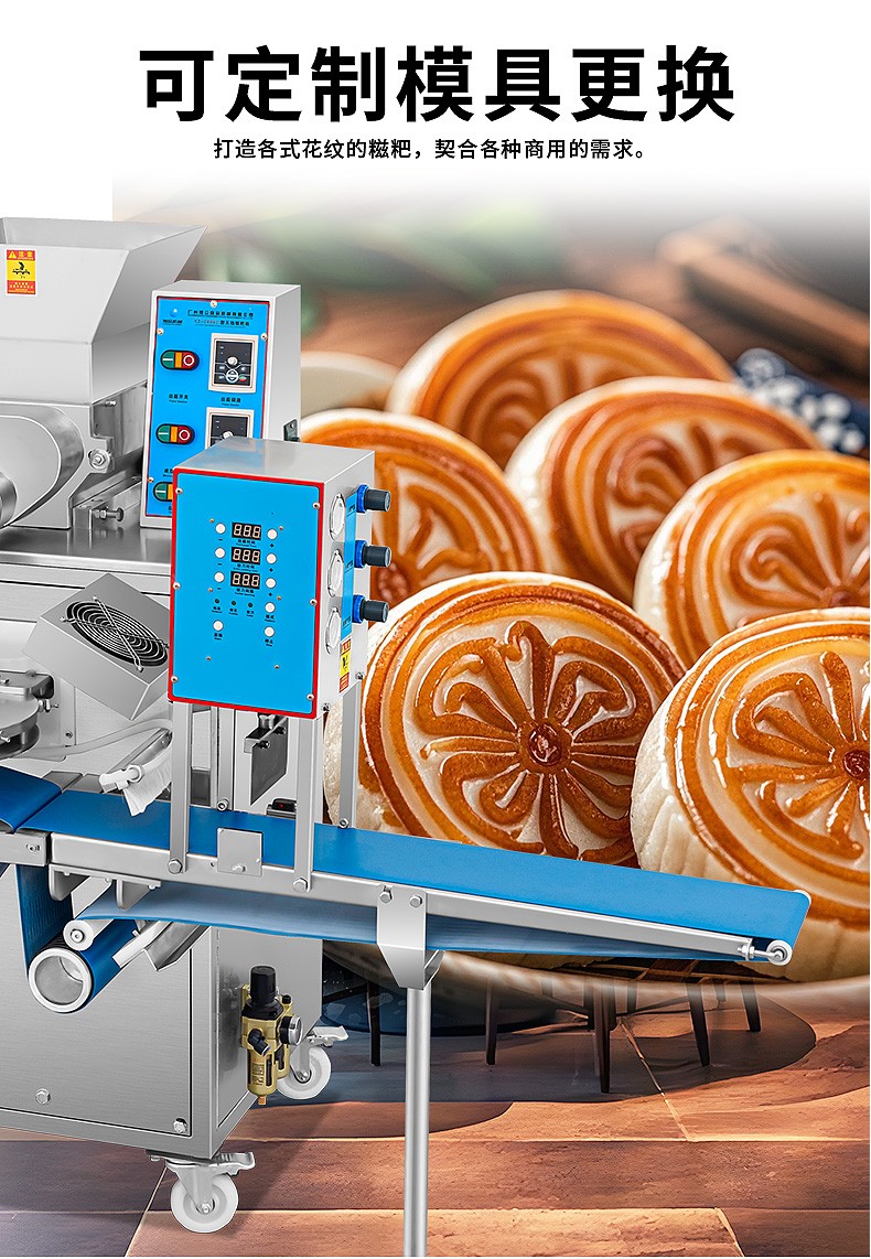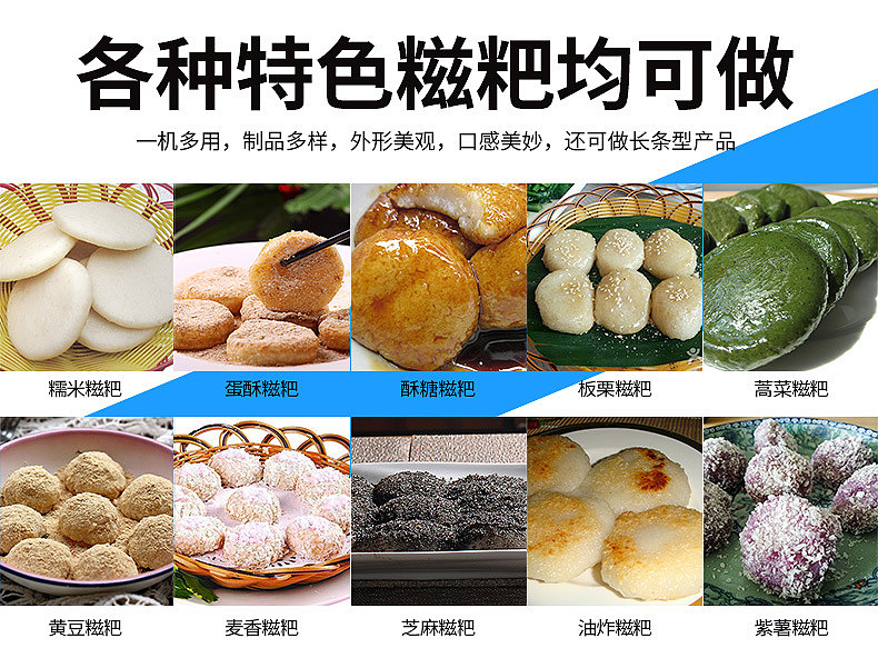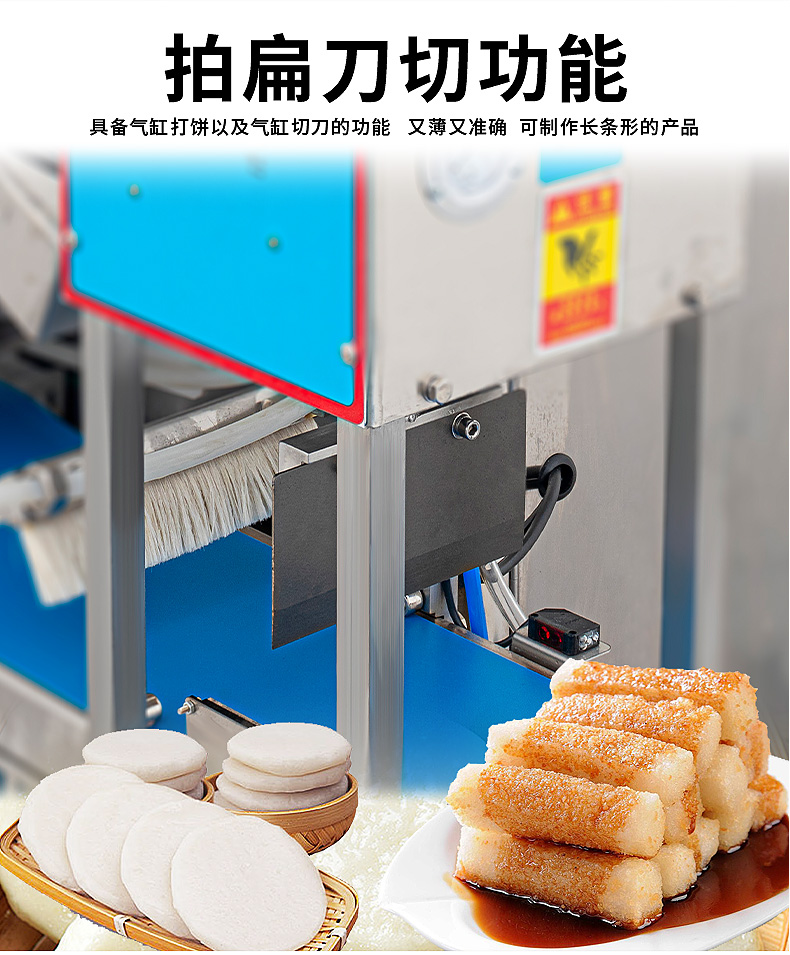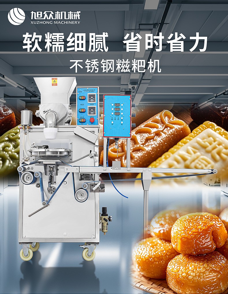 XZ-5000C糍粑機,軟糯細膩、省時省力,不銹鋼糍粑機。智能控制面板,智能內(nèi)芯控制,可自由調(diào)節(jié)輸送,切刀和打餅的時間。拍扁刀切功能,具備氣缸打餅以及氣缸切刀的功能、又薄又準確、可制作長條形的產(chǎn)品。