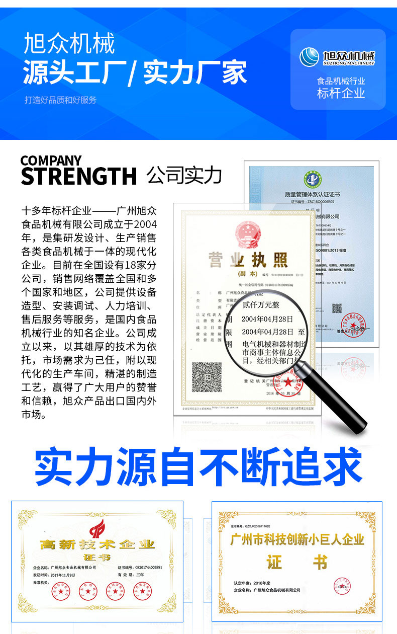 廣州旭眾食品機械有限公司是一家集科研開發(fā),生產(chǎn)設(shè)計,營銷服務(wù)為一體的現(xiàn)代化生產(chǎn)企業(yè)?,F(xiàn)代化生產(chǎn)車間,精湛制造技術(shù),所產(chǎn)機械歷經(jīng)市場重重考驗,不斷贏得海內(nèi)外客戶的贊譽。