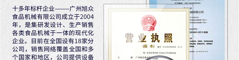 廣州旭眾食品機(jī)械有限公司是一家集科研開發(fā),生產(chǎn)設(shè)計(jì),營(yíng)銷服務(wù)為一體的現(xiàn)代化生產(chǎn)企業(yè)。現(xiàn)代化生產(chǎn)車間,精湛制造技術(shù),所產(chǎn)機(jī)械歷經(jīng)市場(chǎng)重重考驗(yàn),不斷贏得海內(nèi)外客戶的贊譽(yù)。
