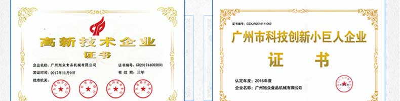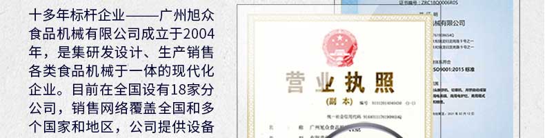 廣州旭眾食品機械有限公司是一家集科研開發(fā),生產(chǎn)設計,營銷服務為一體的現(xiàn)代化生產(chǎn)企業(yè)。現(xiàn)代化生產(chǎn)車間,精湛制造技術,所產(chǎn)機械歷經(jīng)市場重重考驗,不斷贏得海內(nèi)外客戶的贊譽。