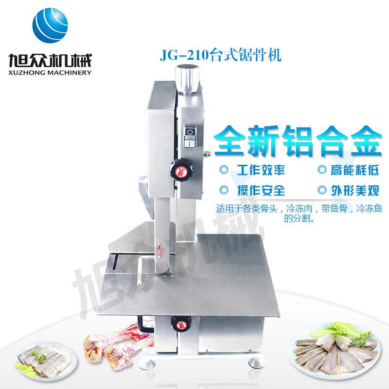 JG-210臺式鋸骨機,適用于各類骨頭,冷凍肉,帶魚骨,冰塊,冷凍魚的分割。采用全不銹鋼材料制作,具有工作效率高,操作安全的特點。廣泛適用于食品加工廠,屠宰場,肉類加工廠等