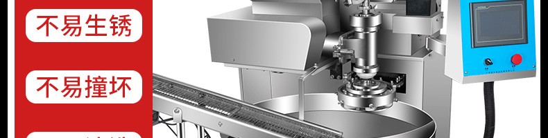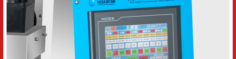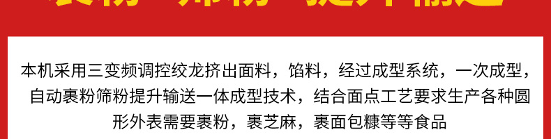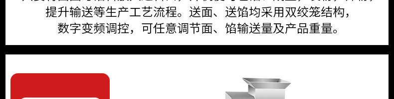 VFD-4000D麻薯機,操作簡單定量準確只要將面團與餡料放入進料口,開機便可包餡、成型,裹粉,篩粉,提升輸送等生產(chǎn)工藝流程。送面、送餡均采用雙絞籠結構,數(shù)字變頻調(diào)控,可任意調(diào)節(jié)面、餡輸送量及產(chǎn)品重量。