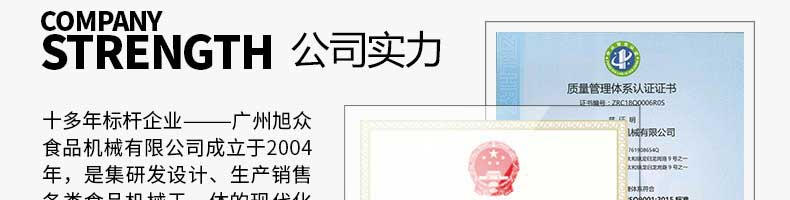廣州旭眾食品機(jī)械有限公司是一家集科研開(kāi)發(fā),生產(chǎn)設(shè)計(jì),營(yíng)銷(xiāo)服務(wù)為一體的現(xiàn)代化生產(chǎn)企業(yè)?,F(xiàn)代化生產(chǎn)車(chē)間,精湛制造技術(shù),所產(chǎn)機(jī)械歷經(jīng)市場(chǎng)重重考驗(yàn),不斷贏得海內(nèi)外客戶(hù)的贊譽(yù)。