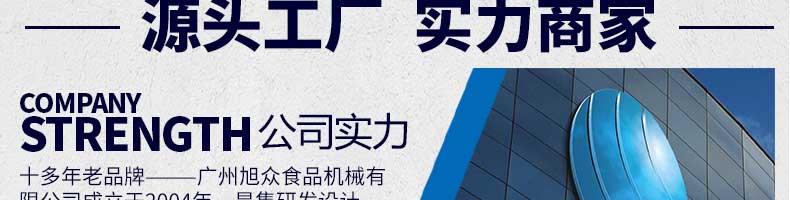 廣州旭眾食品機械有限公司是一家集科研開發(fā),生產(chǎn)設(shè)計,營銷服務(wù)為一體的現(xiàn)代化生產(chǎn)企業(yè)?,F(xiàn)代化生產(chǎn)車間,精湛制造技術(shù),所產(chǎn)機械歷經(jīng)市場重重考驗,不斷贏得海內(nèi)外客戶的贊譽。