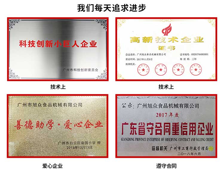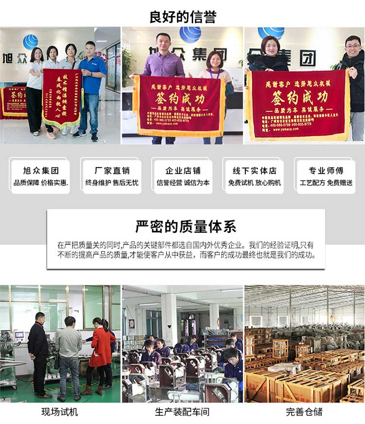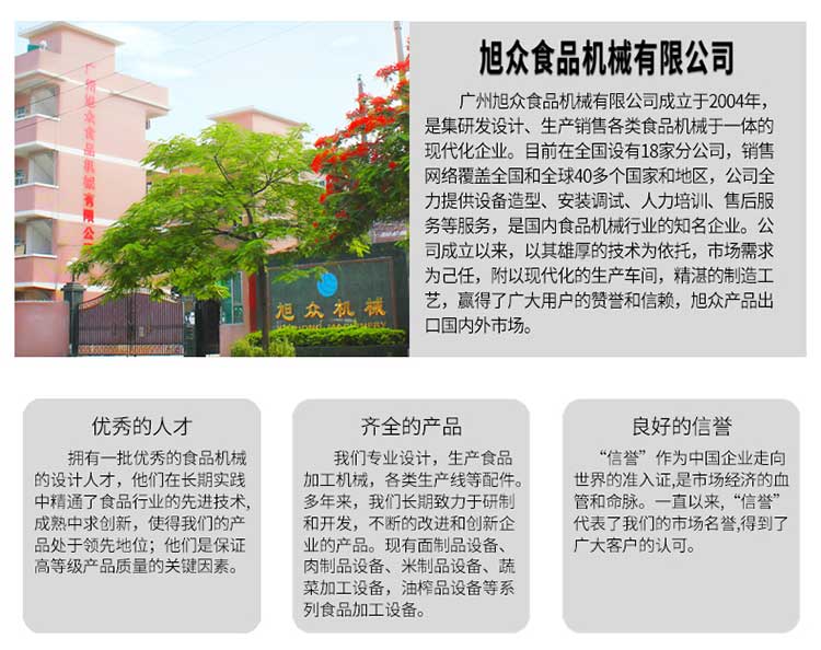 廣州旭眾食品機械有限公司是一家集科研開發(fā),生產(chǎn)設計,營銷服務為一體的現(xiàn)代化生產(chǎn)企業(yè)?,F(xiàn)代化生產(chǎn)車間,精湛制造技術,所產(chǎn)機械歷經(jīng)市場重重考驗,不斷贏得海內外客戶的贊譽。