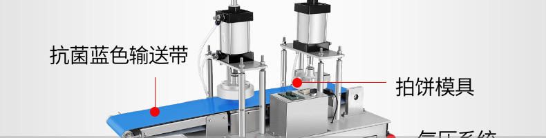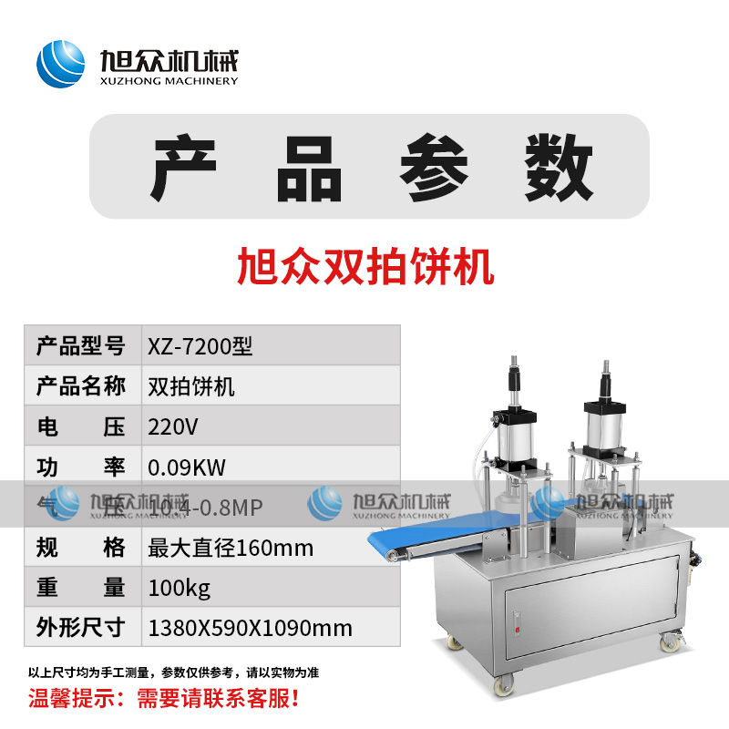 XZ-7200型雙拍餅機,雙氣缸雙拍餅機雙氣缸分兩次拍扁,大大提高了產(chǎn)品的優(yōu)良性;拍的更均勻平整。搭配酥餅杋、月餅機、糍粑機使用。告別手工、更高效率。讓拍餅機改變生活,降低手工成本,省去繁瑣的手工工序,提高生活品質(zhì)。