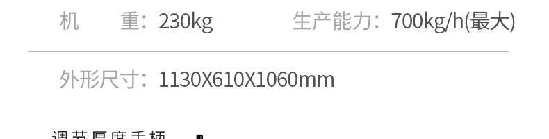 名稱350A壓面機 電源220v 功率2.2kw 產(chǎn)量755kg/h 尺寸1130*610*1060mm 重量230kg 規(guī)格壓面寬度:<350mm 其他