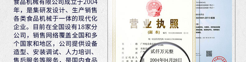 廣州旭眾食品機械有限公司是一家集科研開發(fā),生產(chǎn)設(shè)計,營銷服務(wù)為一體的現(xiàn)代化生產(chǎn)企業(yè)?,F(xiàn)代化生產(chǎn)車間,精湛制造技術(shù),所產(chǎn)機械歷經(jīng)市場重重考驗,不斷贏得海內(nèi)外客戶的贊譽。