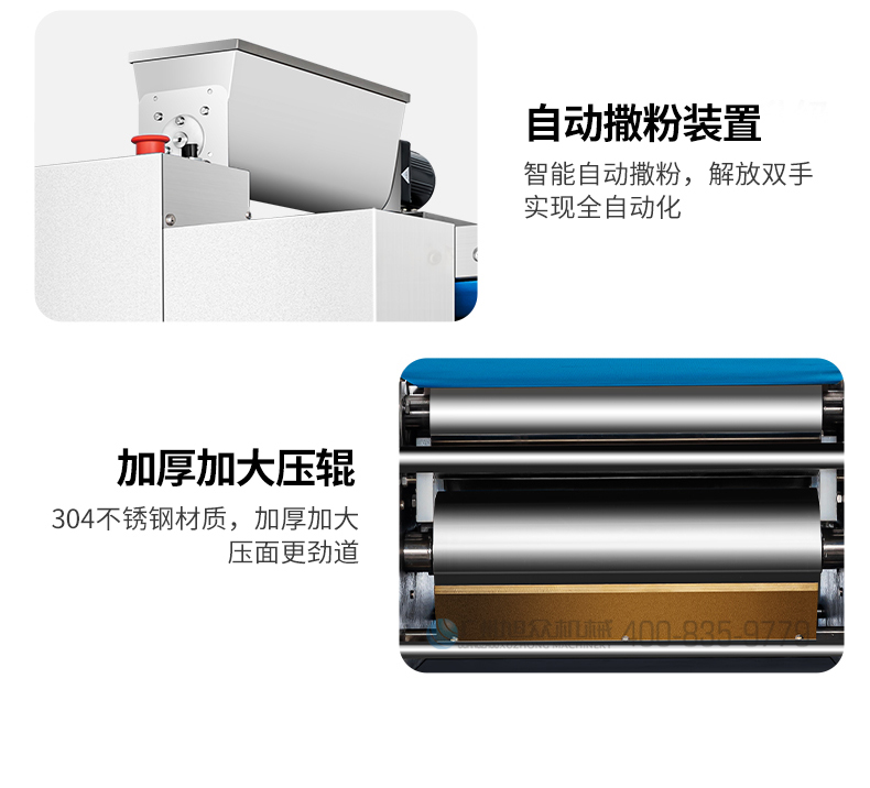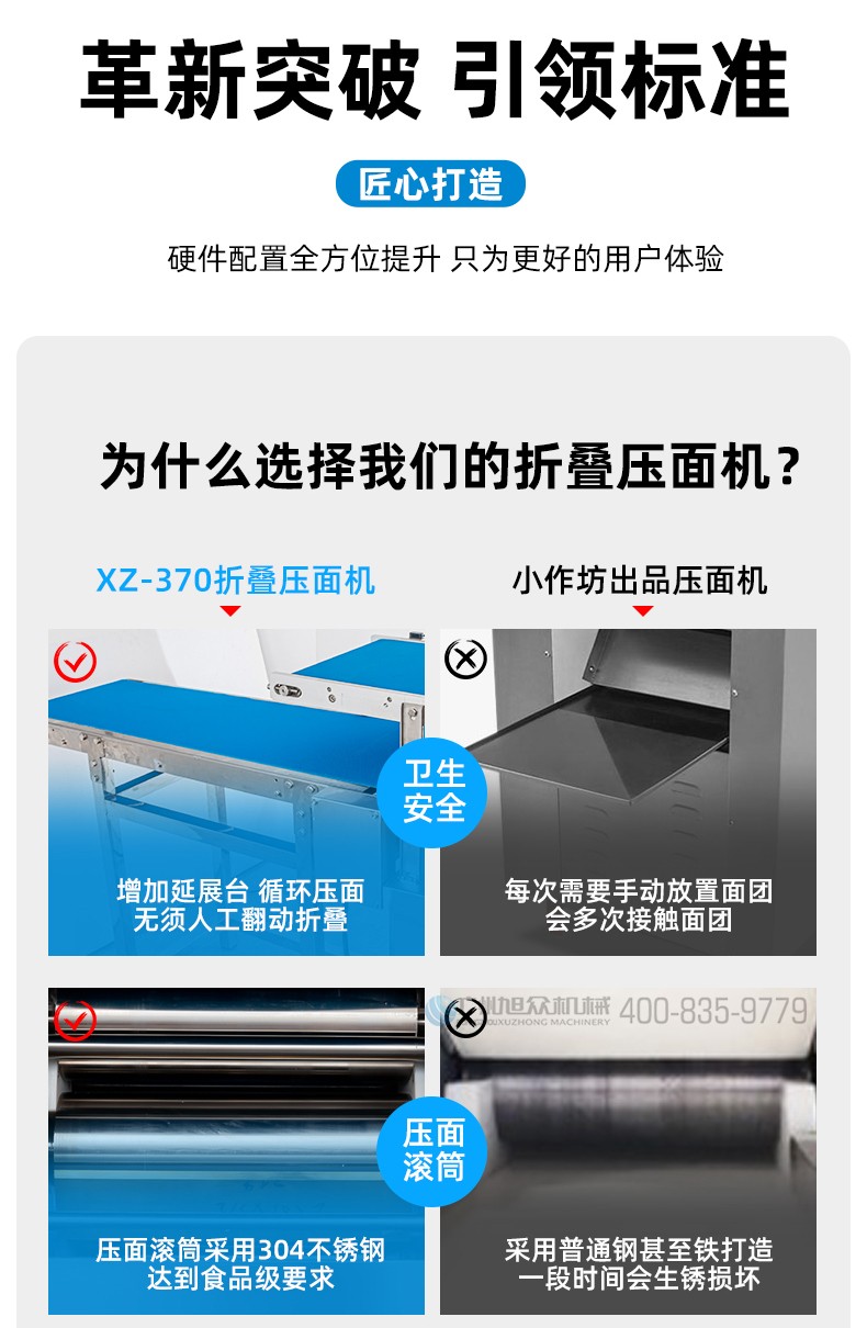 XZ-ZDYMJ370型自動折疊壓面機,整機不銹鋼機身打造,真材實料,選用不銹鋼材質,打造經(jīng)久耐用、防腐蝕。匠心細節(jié),彰顯品質貼心設計。一鍵設定壓面次數(shù),智能定時,只需設定好壓面次數(shù),就能全自動壓面出面。