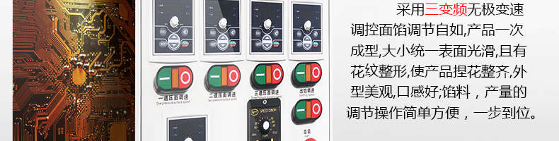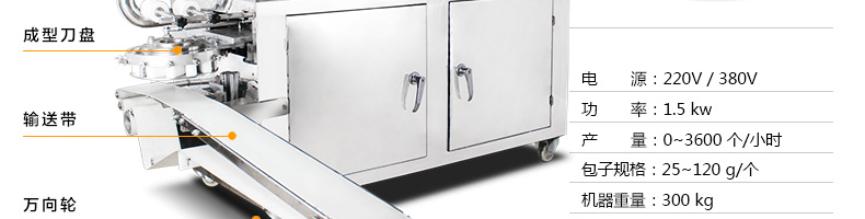 名稱(chēng)290III卷面式包子機(jī) 電源220/380V(見(jiàn)機(jī)器名牌) 功率2.4kw 產(chǎn)量0-3600個(gè)/小時(shí) 尺寸2050*1470*1480mm(包括輸送帶) 重量400kg 規(guī)格25-130克/個(gè) 其他