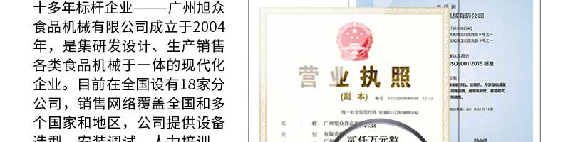 廣州旭眾食品機械有限公司是一家集科研開發(fā),生產(chǎn)設(shè)計,營銷服務為一體的現(xiàn)代化生產(chǎn)企業(yè)?,F(xiàn)代化生產(chǎn)車間,精湛制造技術(shù),所產(chǎn)機械歷經(jīng)市場重重考驗,不斷贏得海內(nèi)外客戶的贊譽。