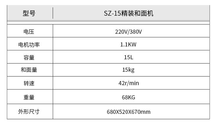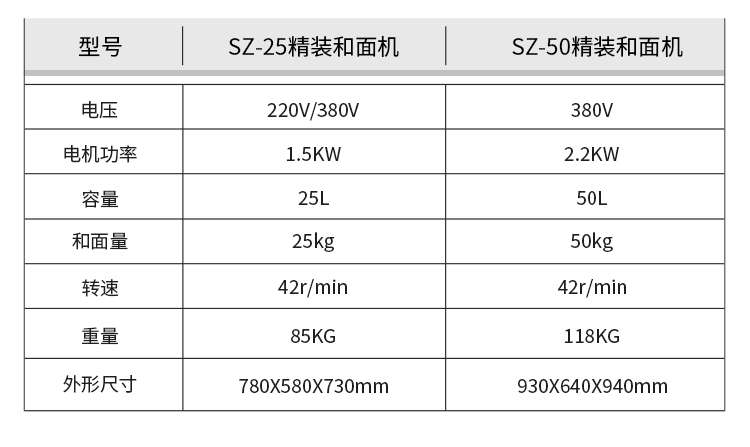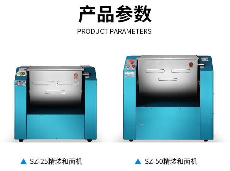 名稱SZ-25精裝和面機(jī) 電源220V/380V 功率電機(jī)功率1.5KW 產(chǎn)量和面量25kg 尺寸780X580X730mm 重量85KG 規(guī)格容量25L、轉(zhuǎn)速42r/min 其他