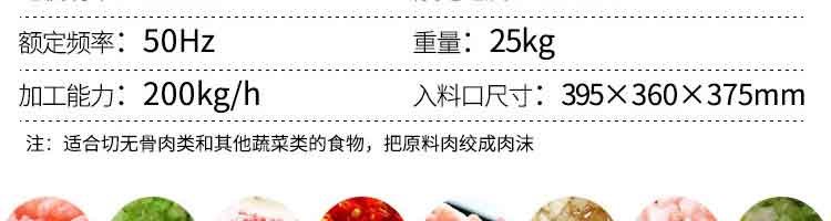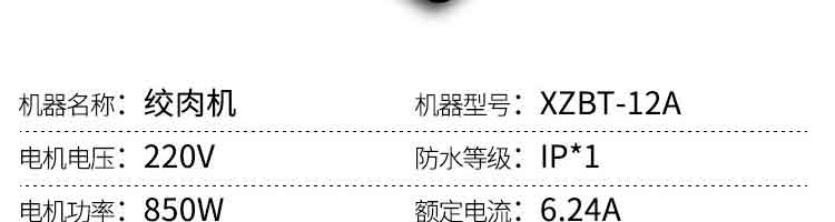 名稱XZBT-12A絞肉機 電源220V 功率850W 產量 尺寸395×360×375mm 重量25kg 規(guī)格 其他
