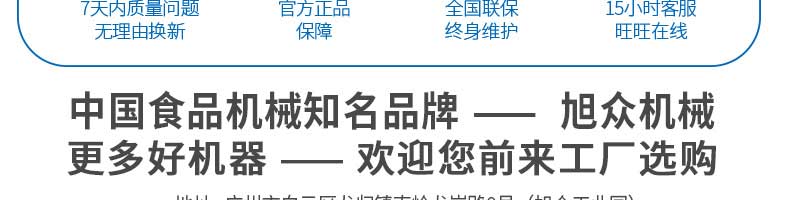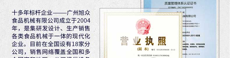 廣州旭眾食品機(jī)械有限公司是一家集科研開發(fā),生產(chǎn)設(shè)計,營銷服務(wù)為一體的現(xiàn)代化生產(chǎn)企業(yè)。現(xiàn)代化生產(chǎn)車間,精湛制造技術(shù),所產(chǎn)機(jī)械歷經(jīng)市場重重考驗,不斷贏得海內(nèi)外客戶的贊譽(yù)。