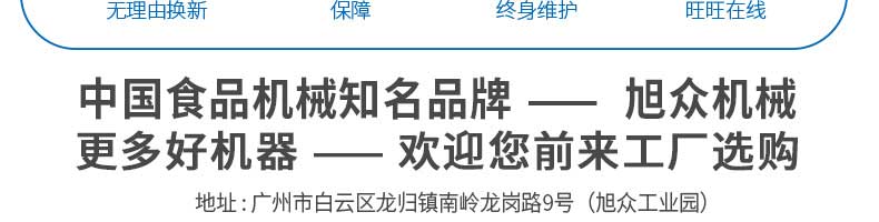廣州旭眾食品機(jī)械有限公司是一家集科研開發(fā),生產(chǎn)設(shè)計(jì),營(yíng)銷服務(wù)為一體的現(xiàn)代化生產(chǎn)企業(yè)?,F(xiàn)代化生產(chǎn)車間,精湛制造技術(shù),所產(chǎn)機(jī)械歷經(jīng)市場(chǎng)重重考驗(yàn),不斷贏得海內(nèi)外客戶的贊譽(yù)。