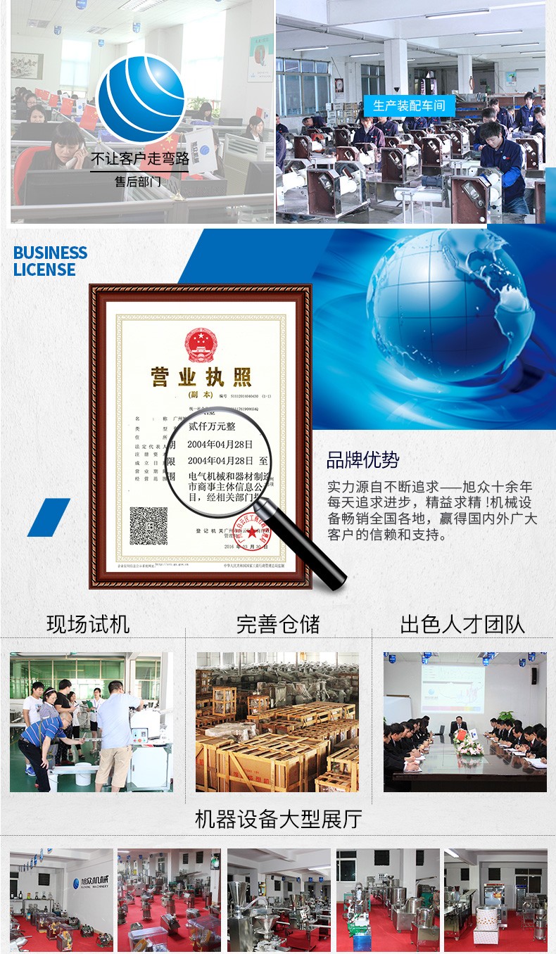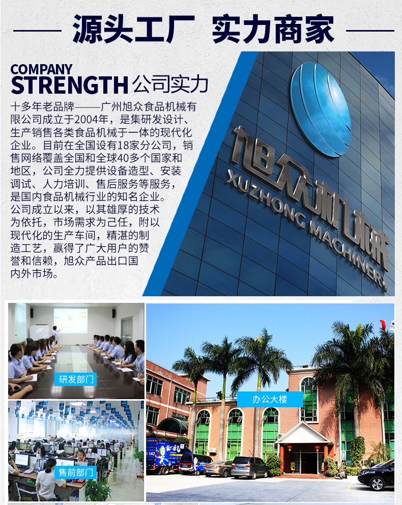 廣州旭眾食品機(jī)械有限公司是一家集科研開(kāi)發(fā),生產(chǎn)設(shè)計(jì),營(yíng)銷(xiāo)服務(wù)為一體的現(xiàn)代化生產(chǎn)企業(yè)?,F(xiàn)代化生產(chǎn)車(chē)間,精湛制造技術(shù),所產(chǎn)機(jī)械歷經(jīng)市場(chǎng)重重考驗(yàn),不斷贏得海內(nèi)外客戶的贊譽(yù)。