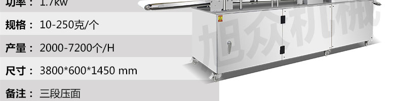 名稱MP900型刀切饅頭成型機 電源220/380V(見機器名牌) 功率1.7kw 產(chǎn)量2000-7200個/小時 尺寸3800*600*1450mm 重量450kg 規(guī)格10-250克/個 其他三段壓面