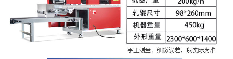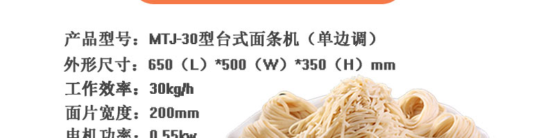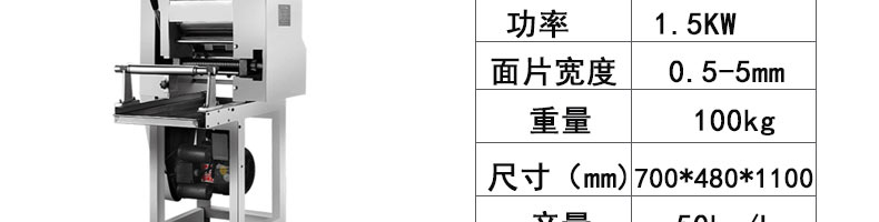 名稱30型全自動壓面面條機(jī) 電源220v 功率0.55kw 產(chǎn)量30kg/h 尺寸650*500*350mm 重量45kg 規(guī)格 其他