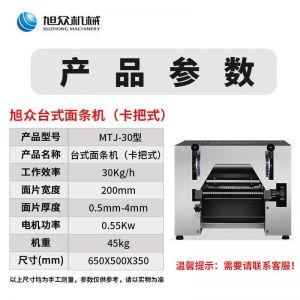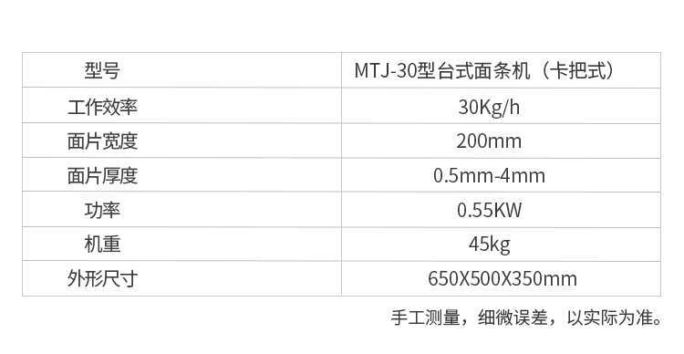 名稱MTJ-30型臺式面條機(卡把式) 電源 功率0.55KW 產量30kg/h 尺寸650X500X350mm 重量45k 規(guī)格面片寬度200mm面片厚度0.5mm-4mm 其他