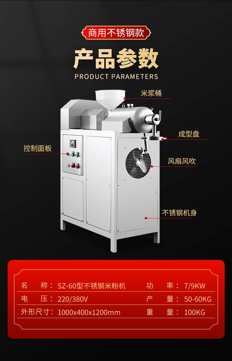 名稱SZ-60不銹鋼米粉機(jī) 電源220/380V 功率5.5kw 產(chǎn)量50-60kg/h 尺寸1230*450*1220mm 重量100kg 規(guī)格 其他