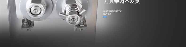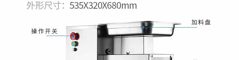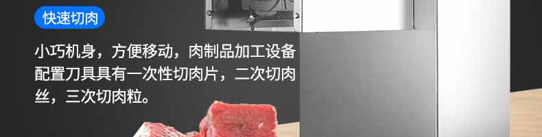 XZ-QX320-切肉機,小型切肉機是一款主要對肉類進行加工的設(shè)備,配置單層刀具一次性切肉片,二次切肉絲,再切成料。刀具采取外置懸臂式設(shè)計,拆洗方便,衛(wèi)生更有保障;配置多種刀具,可加工不同厚度的肉片,實現(xiàn)一機多用;機內(nèi)裝有安全保護開頭,刀具外露時,機器自鎖不能啟動,以保安全;卸下的刀具,不用清洗直接放置在6攝氏度以下的冰箱里,刀具余肉不發(fā)臭。刀片用特殊不銹鋼材料制造,經(jīng)久耐用。