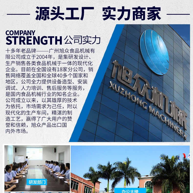 廣州旭眾食品機械有限公司是一家集科研開發(fā),生產(chǎn)設(shè)計,營銷服務(wù)為一體的現(xiàn)代化生產(chǎn)企業(yè)?,F(xiàn)代化生產(chǎn)車間,精湛制造技術(shù),所產(chǎn)機械歷經(jīng)市場重重考驗,不斷贏得海內(nèi)外客戶的贊譽。