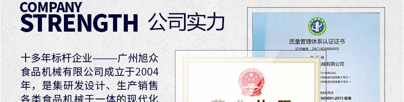 廣州旭眾食品機(jī)械有限公司是一家集科研開發(fā),生產(chǎn)設(shè)計(jì),營(yíng)銷服務(wù)為一體的現(xiàn)代化生產(chǎn)企業(yè)。現(xiàn)代化生產(chǎn)車間,精湛制造技術(shù),所產(chǎn)機(jī)械歷經(jīng)市場(chǎng)重重考驗(yàn),不斷贏得海內(nèi)外客戶的贊譽(yù)。