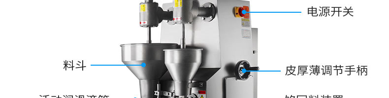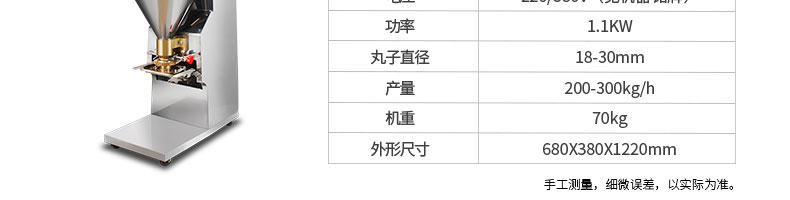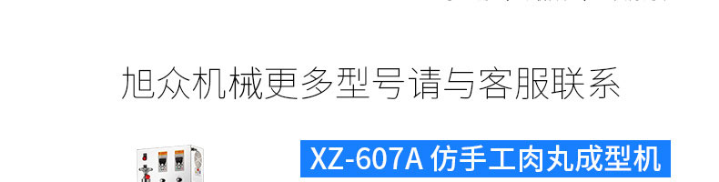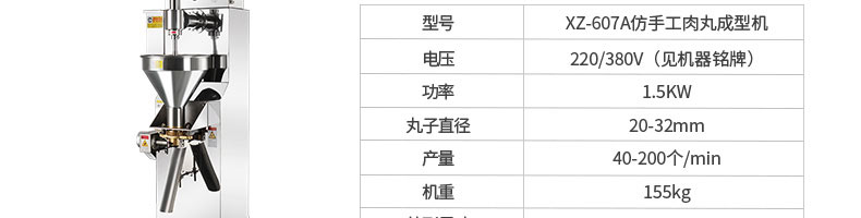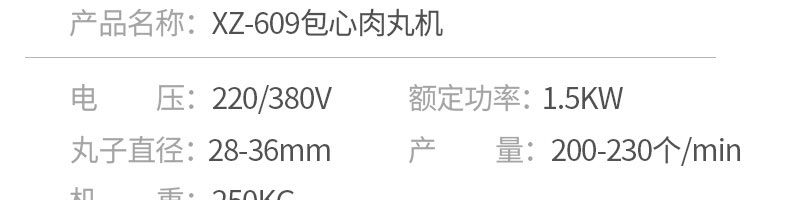 名稱XZ-609包餡肉丸機(jī) 電源220/380v 功率1.5kw 產(chǎn)量200-300個/min 尺寸730*540*1780mm 重量250kg 規(guī)格丸子直徑:28-36mm 其他
