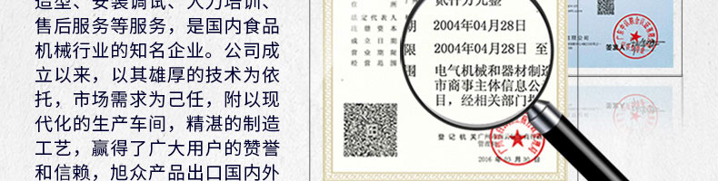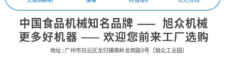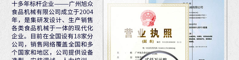 廣州旭眾食品機(jī)械有限公司是一家集科研開發(fā),生產(chǎn)設(shè)計,營銷服務(wù)為一體的現(xiàn)代化生產(chǎn)企業(yè)?,F(xiàn)代化生產(chǎn)車間,精湛制造技術(shù),所產(chǎn)機(jī)械歷經(jīng)市場重重考驗(yàn),不斷贏得海內(nèi)外客戶的贊譽(yù)。