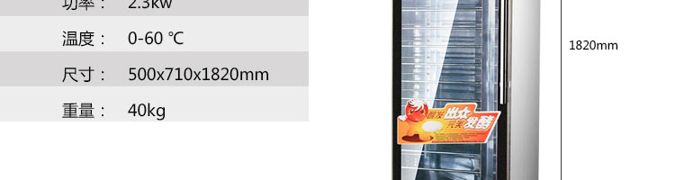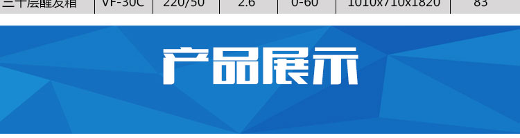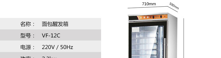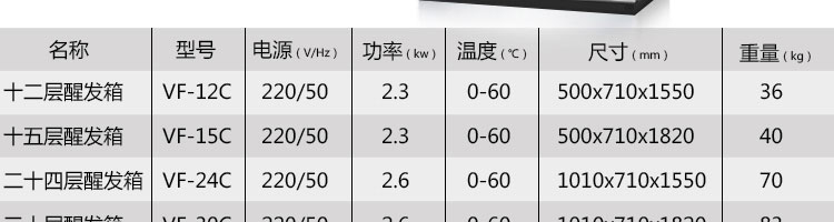 名稱VF多層面包醒發(fā)箱系列 電源220V/50Hz 220V/50Hz 220V/50Hz 220V/50Hz 功率2.3kw 2.3kw 2.6kw 2.6kw 產量 尺寸外形尺寸500*710*1550mm 500*710*1820mm 1010*710*1550mm 重量36kg 40kg 70kg 83kg 規(guī)格 其他