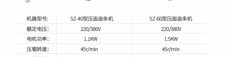 名稱sz系列-壓面面條機(jī) 電源220/380V 功率1.1KW,1.5KW 產(chǎn)量40-50KG,50-60KG 尺寸580*370*1000mm,450*400*860mm 重量75KG,85kg 規(guī)格 其他