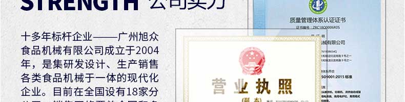 廣州旭眾食品機械有限公司是一家集科研開發(fā),生產設計,營銷服務為一體的現(xiàn)代化生產企業(yè)?,F(xiàn)代化生產車間,精湛制造技術,所產機械歷經市場重重考驗,不斷贏得海內外客戶的贊譽。