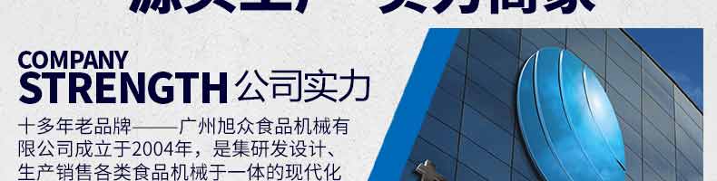 廣州旭眾食品機(jī)械有限公司是一家集科研開(kāi)發(fā),生產(chǎn)設(shè)計(jì),營(yíng)銷服務(wù)為一體的現(xiàn)代化生產(chǎn)企業(yè)?,F(xiàn)代化生產(chǎn)車間,精湛制造技術(shù),所產(chǎn)機(jī)械歷經(jīng)市場(chǎng)重重考驗(yàn),不斷贏得海內(nèi)外客戶的贊譽(yù)。